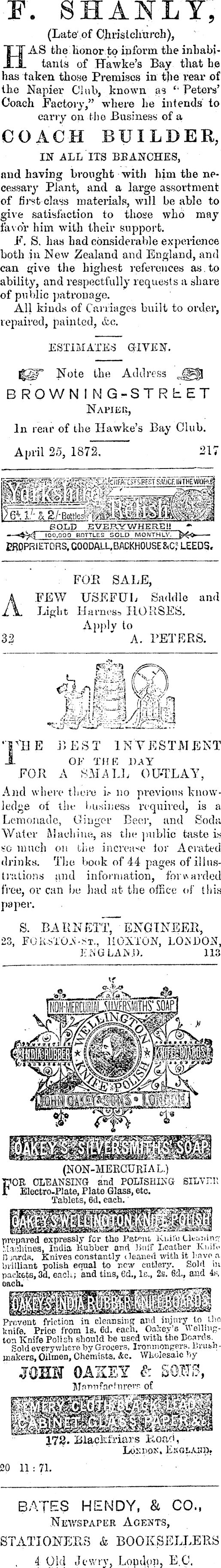 (Late' of Chrislchitrch), AS the lionor to inform tlie inhabihas taken those Premises in the rear of the Napier Club, known as *' Peters' Coach Factory," where he intends' to carry on the Business of a IN ALL ITS BBANCHES, and having brought with him the necessary Plant, and a large assortment of first class materials, will be able to give satisfaction to those who may favor him with their support. F. S. has had considerable experience both in New Zealand and England, and can give the highest references as. to ability, and respectfully requests a share of public patronage. All kinds of Carnages built to order, repaired, painted, &c. ESTIMATES GIVEN. Note the Address jgfl BROWNiNG-STRhET Napier, In rear of the Hawke's Bay Club. April 25, 1872, 21 BOLD EVERYWHERE" *3 100,000 BOTTLES SOLD MONTHLY'. » EROPRIETORS, COODALL.BADKHOUSE&C? LEEDS. FOE SALE, FEW USEFUL Saddle and Light Harness HORSES. Apply to A. PETERS. , ... 3 P> ES T 1N VRST ME K _ ! . OF THE DAY FOR A SMALL OUTLAY, And where there i.- no previous knowledge of the business required, is a Lemonade, Ginger Beer, and Soda Water Machine, as the public taste is so much on the increase tor Aerated drinks. The book of 44 pa trations and information, forwarded fvea, or can be had at the office of this paper. S. BA R N ETtT EKG TNEEE, 23, FOR.Sim : -?>T., IIOXTON, LONDON, EJSGLAKJ). 113 (NON-MERCURIAL.) 10R CLEANSING and POLISHING SILVER Electro-Plate, Plate Glass, etc. Tablets, 6d, each. prepared expressly for the Patent, kuil'e Lleamnr; Machines, India Kubber and IhiiT Leather Knii'o Doardß. Knives constantly cleaned with it have n brilliant polish equal to new cutlery. Sold in packets, 3d. each; and tins, Cd., le., 2a. Sd., and 4h, each. Prevent friction in cleansing and injury to •> knife. Price from Is. 6d. each. Carey's Welling ton Knife Polish should be used with the Boards. Sold everywhere by Grocers, Ironmongers. Brush makers, Oilmen, Chemists. &c. Wholesale by JOHH OASEY & SQITS, MfipnfachireiT of 178. Blackfriars Koacl, LoKIiOK. Ekglaud. 20 11 : 71. BATES HENDY, & CO., Newspaper Agents, STATIONERS & BOOKSELLERS 4 Old Jewry. London, E.G.