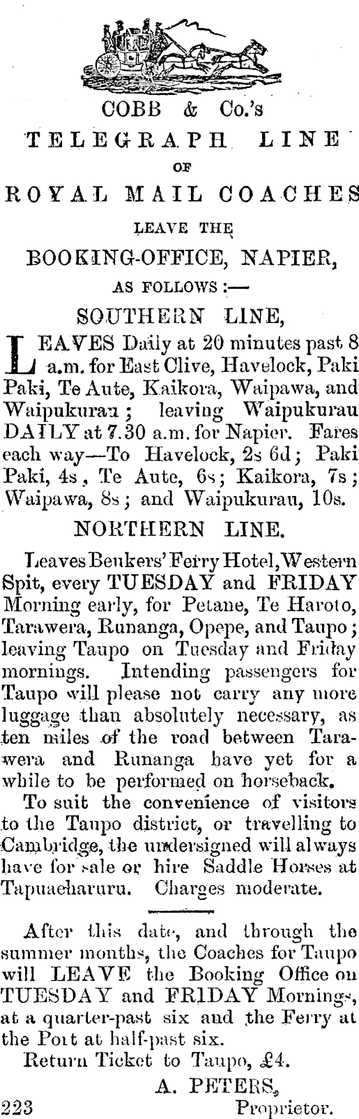 COBB & Co.'s TELEGRAPH LINE ROYAL MAIL COACHES LEAVE THE BOOKING-OFFICE, NAPIER, AS FOLLOWS : SOUTHERN LINE, LEAVES Daily at 20 minutes past 8 a.m. for East Clive, Havelock, Paki Paki, Te Ante, Kaikora, Waipawa, and Waipukurau.; leaving Waipukurau DAILY at 7.30 a.m. for Napier. Fares each way—To Havelock, 2s 6d; Paki Paki, 45., Te Aute, 6s; Kaikora, 7s; Waipawa, 8s; and Waipukurau, 10s. NORTHERN LINE. Leaves Beukers' Ferry Hotel, Western Spit, every TUESDAY and FRIDAY Morning early, for Petane, Te Haroto, Tarawera, Runanga, Opepe, and Taupo; leaving Taupo on Tuesday and Friday mornings. Intending passengers for Taupo will please not carry any more luggage than absolutely necessary, as ten miles of the road between Tarawera and Runanga have yet for a while to be performed on horseback. To suit the convenience of visitors to the Taupo district, or travelling to Cambridge, the undersigned will al ways have for or hire Saddle Horses at Tapuaeharuru. Charges moderate. After this date, and through the summer months, the Coaches for Taupo will LEAYE the Booking Office on TUESDAY and FRIDAY Mornings, at a quarter-past six and the Feriy at the Poit at half-past six. Return Ticket to Taupo, £4. A. PETERS* 223 Proprietor.