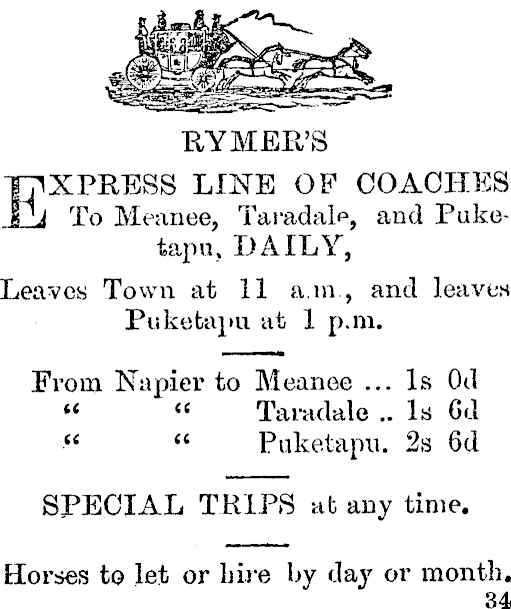 RYMEE'S TjiXPRESS LINE OF COACHES I U To Meanee, Taradalf 1 , and Puketap a, DAILY, Leaves Town at 11 a.m., and leaves Puketapu at 1 p.m. From Napier to Meanee ... Is Od " « Taradale .. Is Gd " " Puketapu. 2s 6d SPECIAL TRIPS at any time. Horses to let or Lire by day or month. 34