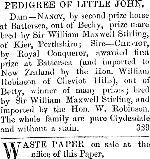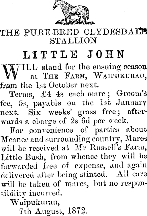 THE PUJ&E BKED CLYDESJ3AISR STALLION LITTLE JOHN T"f TILL stand for the ensuing season VV at The Farm, Waipukueau, &QBQ. the Ist October next. Terms, <£4 4s each mare; -Groom's fee, ss, payable on the Ist January next. Six weeks' grass free; afterwards a charge of 2s 6d per week. For convenience of parties about Meanee and surrounding country, Mares will be received at Mr Russell's Farm, Little Bush, from whence they will be forwarded free of expense, and again delivered after being minted. All care will be taken of mares, but no responsibility incurred. Waipukurau, 7th August, 1872.