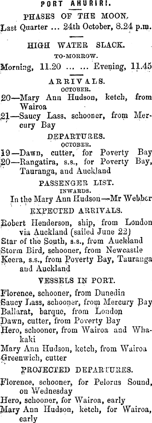 PORT AHURIRI. PHASES OF THE MOON, Last Quarter ... 24th October, 8.24 p.m. HIGH WATER SLACK. TO-MORROW. Morning, 11.20 Evening, 11.45 ARRIVALS. OCTOBER. 20 —Mary Ann Hudson, ketch, from Wairoa 21 —Saucy Lass, schooDer, from Mercury Bay DEPARTURES. OCTOBER. 19 —Dawn, cutter, for Poverty Bay 20 —Rangatira, s.s., for Poverty Bay, Tauranga, and Auckland PASSENGER LIST. INWARDS. In the Mary Ann Hudson Webber EXPECTED ARRIVALS. Eobert Henderson, ship, from London via Auckland (sailed June 22) Star of the .South, s.s., from Auckland Storm Bird, schooner, from Newcastle l£eera, s.s., from Poverty Bay, Tauranga and Auckland VESSELS IN PORT. Florence, schooner, from Dunedin Saucy Lass, schooner, from Mercury Bay Ballarat, barque, from London Dawn, cutter, from Poverty Bay Hero, schooner, from Wairoa and Whakaki Mary Ann Hudson, ketch, from Wairoa Greenwich, cutter PROJECTED DEPARTURES. Florence, schooner, for Pelorus Sound, on Wednesday Hero, schooner, for Wairoa, early Mary Ann Hudson, ketch, for Wairoa, early