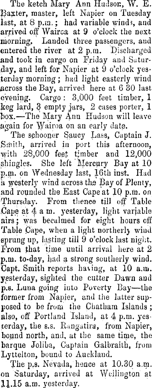 The ketch Mary Ann Hudson, W. E. faster, master, left Napier on Tuesday last, at 8 p.m.; had variable winch, and arrived off Wairca at 9 o'clock the next morning. Landed three passengers, and entered the river at 2 p.m. Discharged and took in cargo on Friday and Saturday, and left for Napier at 9 o'clock yesterday morning; had light easterly wind across the Bay, arrived here at 6 30 last evening. Cargo : 3,000 feet timber, 1 keg lard, 3 empty jars, 2 cases porter, 1 box. —The Mary Ann Hudson will leave .again for Wairoa on an early date. The schooner Saucy Lass, Captain J. Srfiith, arrived in port this afternoon, with 28,000 feet timber and 12,000 shingles. She left Mercury Bay at 10 |>.m. on Wednesday last, J6th inst. Had "a westerly wind across ths Bay of Plenty, and rounded the East Cape at 10 p.m. on Thursday. From thence till off Table .Cape at 4 am. yesterday, light variable airs j was becalmed for eight hours off Table Cape, when a light northerly wind sprung up, lasting till 9 o'clock last night. From that time until arrival here at 2 p.m. to-day, had a strong southerly wind. Capt. Smith reports ha\ing, at 10 a.m. yesterday, sighted the cutter Dawn and p.s. Luna going into Poverty Bay—the former from Napier, and the latter supposed to be from the Chatham Islands; also, off Portland Island, at 4 yesterday, the s.s. Rangatira, from Napier, bound north, and, at the same time, the barque Joliba, Captain Galbraith, from Lyttelton, bound to Auckland. The p.s. Nevada, hence at 10.30 a.m. on Saturday, arrived at Wellington at 11.15 a.m. yesterday.