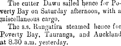 The cutter Dawn sailed hence for Poverty Bay on Saturday afternoon, with a priscellaneous cargo. The s.s. Kungatira steamed hence for poverty Bay, Tauranga, and Auckland at 8.30 a.m. yesterday.