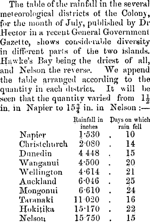 The tahle of the rainfall in the several meteorological districts ot the Colon), for the month of July, published by Dr Hector in a recent General Government Gazette, shows considerable diversity in different parts of the two islands. Hawke's Buy being the driest of all, and Nelson the reverse. We append the table arranged according to the quantity in each district. It will be seen that the quantity varied from in. in Napier to 15| in. in Nelson : Rainfall in pays on which inches rain fell Napier 1-530 . 10 Chrwtclwrch 2080 . 14 Dnnedin 4 448 . 15 Wangauui 4*500 . 20 Wellington 4-614 . 21 Auckland 6-046 . 25 Mongonui 6610 . 24 Tatanaki 11020 . 16 Hokitfka 15-170 . 22 Nelson 15750 . 15