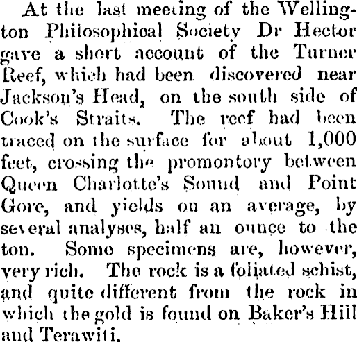 At the last meeting of the Wellington Phiiosophioal Society Dv Hector gave a short account of the Turner Reef, which had been discovered near Jackson's Head, on the south side of Cook's Straits. The reef had been traced on the surface for about 1,000 feet, crossing the promontory between Queen Charlotte's Sound and Point Gore, and yields on an average, by several analyses, half an ounce to the ton. Some specimens are, however, very rich. The rock is a foliated schist, and quite different from the rock in which the gold is found on Baker's Hill and Terawili.