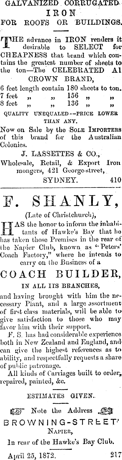 GALVANIZED COBTtTJ GATED, I B 0 N '• FOB EOOFS OR BUILDINGS. THE advance in IRON renders it desirable to SELECT for CHEAPNESS that brand which contains the greatest number of sheets to the ton—The CELEBRATED Al CROWN BRAND, 6 feet length contain 180 sheet 3 to ton. 7 feet „ „ 156 „ „ 8 feet „ „ 136 „ „ QUALITY UNEQUALED-—PRICE LOWER THAN ANY. Now on Sale by the Sole Importers of this brand for the Australian Colonies. J. LASSETTES & CO., Wholesale, Retail, & Export Iron mongers*, 421 George-street, SYDNEY. 410 F. SHANLY, (Late of Chnstchurch/, FT AS the honor to inform the inliabiO. tants of Hawke's Bay that he has taken those Premises in the rear of the Napier Club, known as «• Peters' Coach Factory," where he intends to carry on the Business of a COACH BUILDER, IN ALL ITS BRANCHES, and having brought with him the necessary Plant, and a large assortment of first class materials, will be able togive satisfaction to those who may favor him with their support. F. S. has had considerable experience both in New Zealand and England, and can the highest references as to ability, and respectfully requests a share of public patronage. All kinds of Carriages built to order, repaired, painted, &c. ESTIMATES GIVEN.. i Note the Address BROWNING-STRbET' Napier,. In rear of the Hawke's Bay Club. April 25, 1872. 217