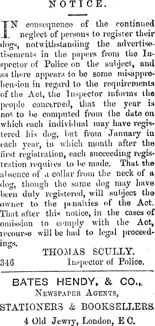 NOTICE. IN consequence of the continued neglect of persons to register their doers notwithstanding the advertisenix tirsenienfcs in the papers from the Inspector of Police on the subject, and as there appears to be some misapprehension in regard to the requirements of the Act, the Inspector informs the people concerned, that the year is no' to be computed from the date on which each individual may have registered his dog, but from January in each year, in which month after the first registration, each succeeding registration requires to be made. That the absence of a collar from the neck of a dog, though the same dog may have been duly registered, will subject; the owner to the penalties of the Act. That after this notice, in the cases of omission to comply with the Act, recourse will be had to legal proceedings. THOMAS SCULLY. 346 Inspector of Police; BATES HENDY, & C0.,.Newspaper Agents, STATIONERS & BOOKSELLERS 4 Old Jewry, London, E C.