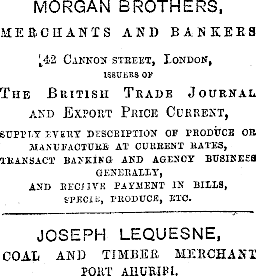 MORGAN BROTHERS. MERCHANTS AND BANKERS [4>2 Cannon street, London, tssuKits or The British Trade Journal and Export Price Current, SUPPLY EVERY DESCRIPTION OF PRODUCE OR MANUFACTURE AT CURRENT KATES, TRANSACT BANKING AND AGENCY BUSINESS GENERALLY, AND RECJIVE PAYMENT IN BILLS, SPECIE, PRODUCE, ETC. JOSEPH LEQUESNE, COAL AND TIMBER MERCHANT POUT AHURIPI.