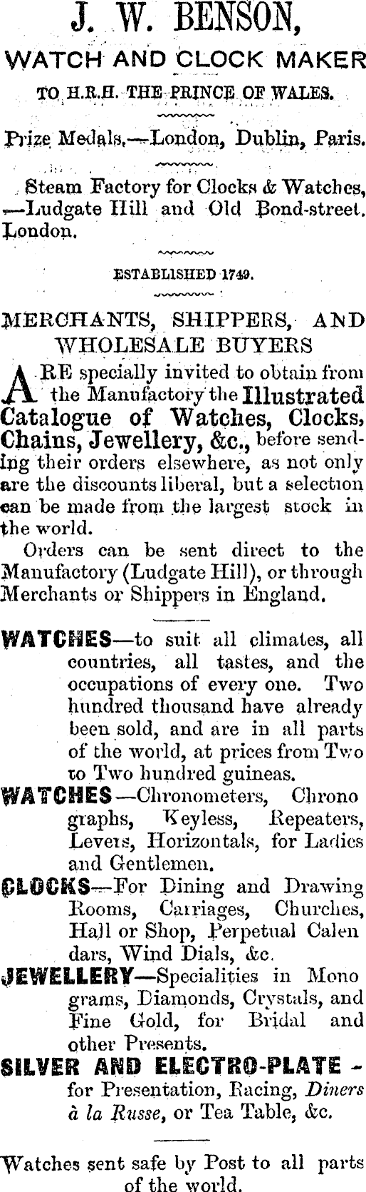 I W. BENSON, WATCH AND CLOCK MAKER $0 1 H.B.H. THE PRINCE CE WALES. JYize Medftls f --«-Londoß, Dublin, Paris. 8 team Factory for Clocks & "Watches, * —Ludgate Hill and Old £ond-street. London. ESTABLISHED 1749. MERCHANTS, SHIPPERS, AftD WHOLESALE BUYERS ARE specialty invited to obtain from the Manufactory the Illustrated Catalogue of Watches, Clocks, Chains, Jewellery, &c, before sending their orders elsewhere, as not only are the discounts liberal, but a selection ©an be made from .the largest stock in the world. Orders can be sent direct to the Manufactory (Ludgate Hill), or through Merchants or Shippers in England. ES—to suit, all climates, all countries, all tastes, and the occupations of every one. Two hundred thousand have already been sold, and are in all parts of the world, at prices from Two to Two hundred guineas. —Chronometers, Chrono graphs, Keyless, Repeaters, Levels, Horizontals, for Ladies and Gentlemen. CS—Eor Dining and Drawing Rooms, Carriages, Churches, Hajl or Shop, Perpetual Calen dars, Wind Dials, &c. sY—Specialities in Mono grams, Diamonds, Crystals, and Fine Gold, for Bridal and other Presents. SILVER AKD ELECTRO-PLATE - for Presentation, Racing, Diners a la Russe, or Tea Table, &c. Watches sent safe by Post to all parts of the world.