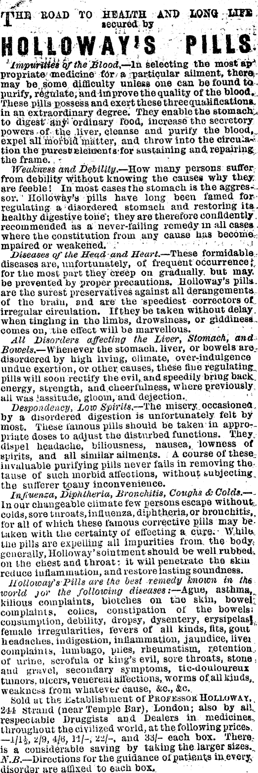 rfiHU BOAD TO HEAIiTH 4NP LONQ MM J- securedvby HailfWAYfS PltU Impttrikea of the JBlood,— ln selecting the most appro pxiate medicine for.-a- xpar ; ticular ailment, thejfftmay be some difficulty unless one can be found td•. purify, regulate; and-improve the quality of the blood.. These pills possess and exert these three quakfleationsin an extraordinary degree. They enable the stomachu to digest' ordinary food, increase the secretory powers of the .liver, cleanse and purify the b100d,., expel ali.morbid matter, and throw into the circus fcion the purest fileiceentafor sustaining and repairing, the frame. - Weakness and Debility.—Royr many persons suffer from debility without knowing the causes why they are feeble! In most cases the stomach is the aggres-.-soiV HolloWay's pills have long been famed for. regulating a -disordered stomach and restoring itshealthy digestive tone'; they are therefore confidently recommended as a never-failing remedy in all cases... where the constitution from any cause has become,: mpairedor weakened, i* V ! Diseases of the Head-and Heart.— These formidable diseases are, unfortunately, of frequent occurrence \ t for the most part they creep on gradually, but may, be prevented by proper precautions. Holloway's pilla. are the surest preservatives against all derangement* of the brain, and are the speediest correctors of, irregular circulation. If they be taken without delay, when tingling in the limbs, drowsiness, or giddiness, comes on, the effect will be marvellous. All Disorders affecting the Liver, Stomach, andBowels.— Whenever the stomach, liver, or bowels aredisordered by high living, climate, over-indulgence undue exertion, or other, causes, these fine pills will soon rectify the evil, and speedily bring back. energy, strength, and cheerfulness, where previously, all was lassitude, gloom, and dejection.. Despondency, Low Spirits.— -The misery.occasioned by a disordered digestion is unfortunately felt by most. These famous pills should be taken in appro--priate doses to adjust the disturbed functions. They, dispel headache, biliousness, nausea, lowness of spirits, and all similar ailments. A course of these, invaluable purifying pills never fails in removing the, tause of such morbid affections, without subjecting, the sufferer tpany inconvenience. Influenza, Diphtheria, Bronchitis, Coughs & Colds. —- In our changeable climate few persons escape without;, colds, sore tliroats, influenza, diphtheria,or bronchitis,, for all of which these famous corrective pills may be. taken with the certainty of effecting a. cuje. - Awhile, the pills are expellins all impurities from, the body, generally, Holloway' s'ointment should be well rubbed, on the chest and throat: it will penetrate the skiu reduce inflammation, and restore lasting soundness. Holloway's Pills are the best remedy known in th 6 world jor the following diseases :—Ague, asthma,„ kilious coinulaints, blotches on the skin, bowel: complaints,* colics, constipation of the bowelsi consumption, debility, dropsy, dysentery, erysipelasj v female irregularities, fevers of all kinds, fits, gout headaches, indigestion, inflammation, jaundice, livei complaints, lumbago, piles, rheumatism, retention, of urine, scrofula or king's evil, sore throats, stone, and gravel, secondary symptoms, tic-douloureux tumors, ulcers, venereal affections, worms of all kinds,, weakness from whatever cause, &c, &c. Sold at the of Pro* ussoa Holloway, . 2±4 strand (near Temple Bar), London; also by all, respectable Druggists and Dealers in medicines, throughout the civilized world, at the following prices,, —llls, */9, 4/6,11/-, tij~, aud 33/- each box. Thereis a considerable saving by taking the larger sizes., 2V T . £.— Directions tor the guidance ol patients in everjr, disorder are affixed to each box.
