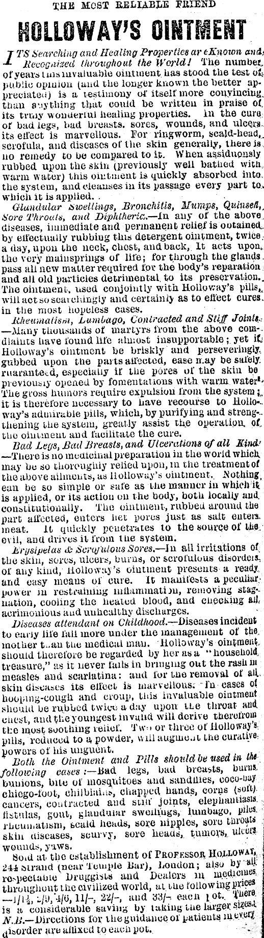 THE MOST RELIABLE IUIEND TTS Searching and Healing Properties art Known and,; ■ Recognised throughout the World! The number, of years mis invaluable ointment has stood the test ok public opinion (and the longer known the better appreciateti) is a testimony of itself more convincing., than a-jything that could be written in praise of. its trmy wonderful healing properties. In the euro of bad legs, bad breasts, sores, wounds, and ulceusits eu'eot is marvellous. For ringworm, scald-head,, scrofula, and diseases of the skin generally, there is. no remedy to be compared to it. When assiduously rubbed upon the skin (previously well bathed with, warm water) this ointment is quickly absorbed into, the system, and cleanses in its passage every part to, which it is applied. . Glandular swellings, Bronchitis, Mumps, Quiwe/t,. Sore Throats, and Diphtheric—in any of the above diseases, immediate and permanent relief is ootained. by effectually rubbing this detergent ointment, twice, a day, upon the neck, chest, and back, It acts upon, the very mainsprings of life; for through the glands pass all new matter required for the body's reparation and all old particles detrimental, to its preservation.. The ointment, used conjointly with Holloway's pills,, will act so seat ohingly and certainty as to effect cures, in the most hopeless cases. Rheumatism, Lumbago, Contracted and Stiff Joints* —Many thousands of martyrs from the above coia--dlaiuts have found life almost insupportable; yet it Holloway's ointment be briskly and persevering!?, gubbed 'upon the parts affected, ease may be safely ruarantetd, especially if the pores of the skin be previously opened by fomentations with warm, water 1 ' The gross humors require expulsion from the system;,. it is therefore necessary to have recourse to Hollo-., way's admirable pills, which, by purifying and strengthening the system, greatly assist the operation, of.. the ointment and facilitate the cure. Bad Legs, Bad Breasts, and Ulcerations of all Eitui f —There is no medicinal preparation in the world which may be so thoroughly relied upon, in the treatment of the above ailments, as Holloway's ointment... .Nothing, ean be so simple or safe as the manner in which it is applied, or its action on the body, both locally ami. constitutionally. The ointment, rubbed around the part alfected, enters bet pores just as salt eaters, meat. It quickly penetrates to the source of liia. evil, and drives it from the system. Erysipelas & Scrofulous Sores.— Ju all irritations of the skin, sores, ulcers, burns, or scrofulous disorders, of any kind, Holloway's ointment presents a ready and easy means of cure, ft manifests a peculiarpower in restraining MliammatiJU, removing stagflation, cooling the heated blood, and checking all, acrimonious and unhealthy dischurges. Diseases attendant on G7iiM/40od.—Diseases incident to early life fall more under the management of the. mother t.au tue medical man. Holloway's ointment, should therefore be regarded by her as a "household, treasure," as it never fails in bringing out the rash m measles and scarlatina: aud for tne removal of ait skin diseases its effect is marvellous, fn eases ot. hooping-cough and croup, this invaluable ointmeut should he rubbed twice a day upon the throat ami. chest, andtmeyoungest invalid will derive therefrom the most soothing relief. Tw< •or three of Hollo way t pills, reduced to a powder, mil augme.it the curative; powers of his unguent. _,.,*/ Both the Ointment ami Fills should be used m w following cases .—liad legs, bad breasts, bums, bunions, bile of mosquitoes and sandflies, ooeo-uay ehiogo-foot, chilblain?, chapped hands, corns (soil/cancers, contracted and stiif joints, elephantiasis.. fistulas, gout, gtouduiar swellings, lumbago, pi M . ■ rheumatism, scald heads, sore nipples, sore tmo*w skin diseases, scurvy, sore heads, tumors, ulcW* wounds, yaws. T Soul at. the establishment of Pkofkssok, Hallowav, 244 strand (near Temple liar), London; also by air. respectable Druggists and Dealers in mm ™5 throughout the civilized world, at. the following ptfgj -J/li,~M'-i/«,ll/-, 22/-, and 33/-. each lot, JJg is a considerable saving by iaking the larger s N.B.— Directions for the guidance of patients lueW disorder are affixed to each pot. ;*- ;