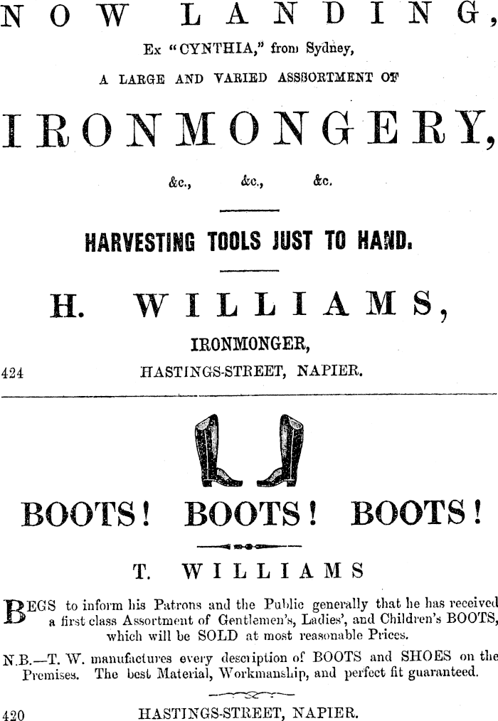 W LA I N G Ex " CYNTHIA," from Sydney, A LABGE AND YARIBD ASSORTMENT 0!F ONGEET, ILLIAMS, IKONMONGER, HASTINGS-STBEET, NAPIER. BOOTS! BOOTS ! BOOTS! T. WILLIAMS EGS to inform his Patrons and the Public generally that he has received ) a first class Assortment of Gentlemen's, Ladies', and Children's BOOTS, which will be SOLD at most reasonable Prices. N.B.—-T. W. manufactures every description of BOOTS and SHOES on the Premises. The best Material, Workmanship, and perfect fit guaranteed. 420 HASTINGS-STREET, NAPIER.