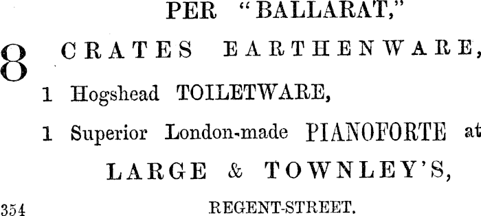 PER "BALLARAT," CRATES EARTHENWARE, 1 Hogshead TOILETWARE, 1 Superior PIANOFORTE at LARGE & TOWNLEY'S, REGENT-STREET.