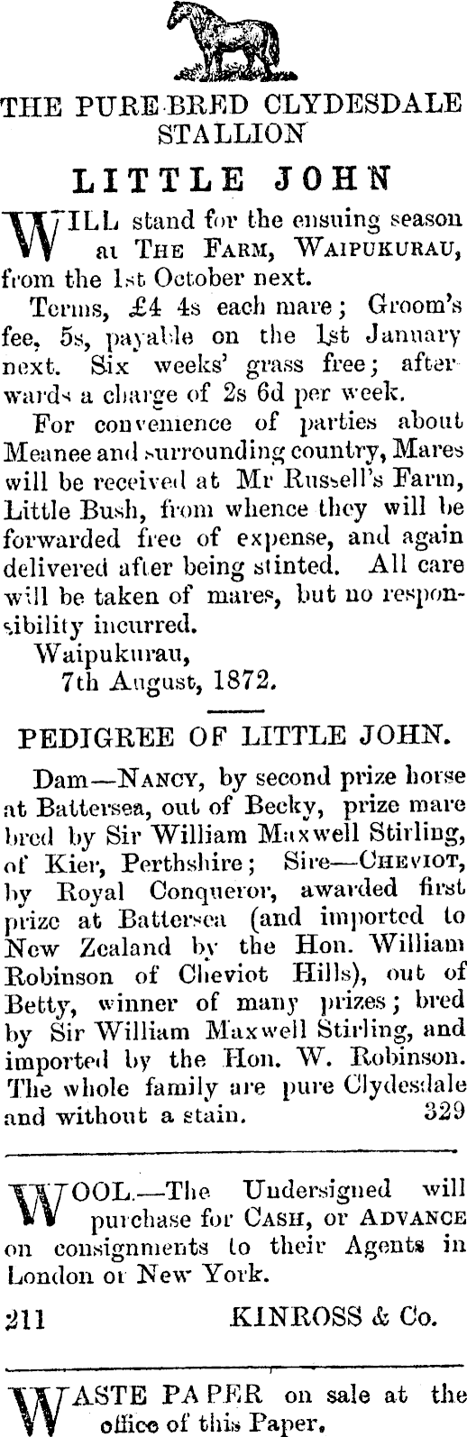THE PURE BRED CLYDESDALE STALLION LITTLE JOHN TILL stand for the ensuing season 1 ai The Farm, Waipukurau, from the Ist October next. Terms, £4 4s each mare; Groom's fee. ss, payable on the Ist January next. Six weeks' grass free; after warch a charge of 2s 6d per week. For convenience of parties about Meanee and .surrounding country, Mares will be received at Mr Russell's Farm, Little Bush, from whence they will be forwarded free of expense, and again delivered after being stinted. All care will be taken of mares, but no responsibility incurred. Waipukurau, 7th August, 1872. PEDIGREE OF LITTLE JOHN. Dam—Nancy, by second prize horse at Battersea, out of Becky, prize mare bred by Sir William Maxwell Stirling, of Kier, Perthshire; Sire—Cheviot, by Royal Conqueror, awarded first prize at Battersea (and imported to New Zealand by the Hon. William Robinson of Cheviot Hills), out of Betty, winner of many prizes; bred by Sir William Maxwell Stirling, and imported by the Hon. W. Robinson. The whole family are pure Clydesdale and without a stain. 329 7"OOL. —The Undersigned will purchase for Cash, or Advance on consignments to their Agents in London or New York. 211 KINROSS & Co. "ASTE PA PER on sale at the office of this Paper,