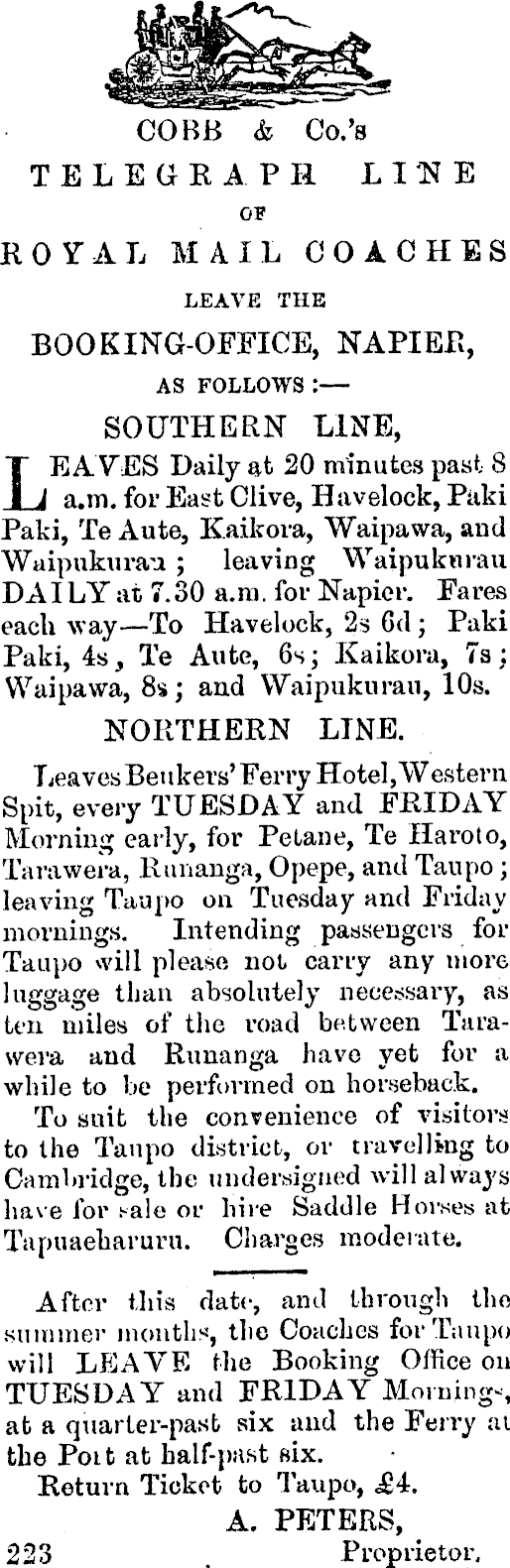 COBB & Co.'s TELEGRAPH LINE ROYAL MAIL COACHES LEAVE THE BOOKING-OFFICE, NAPIER, AS FOLLOWS : SOUTHERN LINE, ' EAVES Daily at 20 minutes past 8 J a.m. for East Clive, Havelock, Paki Paki, Te Aute, Kaikora, Waipawa, and Waipnkurau; leaving Waipukurau DA ILY at 7.30 a.m. for Napier. Fares each way—To Havelock, 2s 6d j Paki Paki, 4s, Te Aute, 6s; Kaikora, 7s: Waipawa, 8s; and Waipukurau, 10s. NORTHERN LINE. Leavesßeukers'Ferry Hotel, Western Spit, every TUESDAY and FRIDAY Morning early, for Petane, Te Ha rot o, Tarawera, Runanga, Opepe, and Taupo; leaving Taupo on Tuesday and Friday mornings. Intending passengers for Taupo will please nol carry any more luggage than absolutely necessary, as ten miles of the road between Tarawera and Runanga have yet for a while to be performed on horseback. To suit the convenience of visitors to the Taupo district, or travelling to Cambridge, the undersigned will always have for sale or hire Saddle Horses at Tapuaeharuru. Charges moderate. After this date, and through the summer months, the Coaches for Taupo will LEAVE the Booking Office on TUESDAY and FRIDAY Mornings at a quarter-past six and the Ferry ai the PoLt at half-past six. Return Ticket to Taupo, ,£4. A. PETERS, "3 Proprietor,