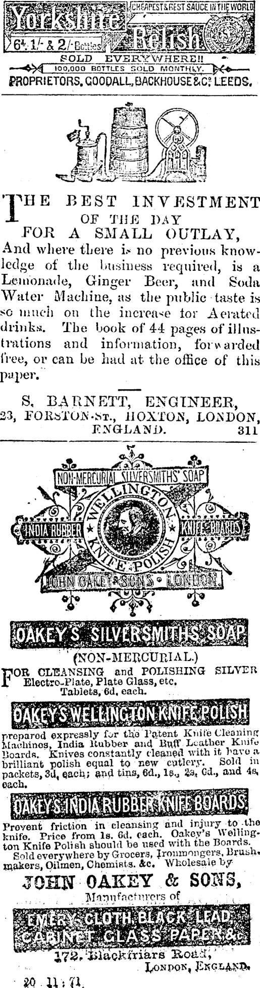 SOLD EVERYWHERE!! PROPRIETORS. GOOPALL,BACKHOUSE&C, 2 LEEDS. BEST INVESTMENT OF THE DAY FOR A SMALL OUTLAY, And where there i? no previous knowledge of the business required, is a Lemonade, Ginger Beer, and Soda Water Machine, as the public taste is so much on the increase lor Aerated drinks. The book of 44 pages of illustrations and information, forwarded IVee, or can be had at the office of this paper. S, BARNETT, ENGINEER, 23, FOBSTOJN'Kt., HOXTON, LOiSDON, ENGLAND. 311 MHERQR a w&m •Jr. IlKEYflliyEfSJiP (NON-MERCURIAL.) FOR CLEANSING and POLISHING SILVER Electro-Plate, Plate Glass, etc. Tablets, 6d, each. prepared expressly for the Patent Knife Cleaning Marihinos, India ltubber and Buff Leather Kmfo Boards. Knives constantly cleaned with it have a brilliant polish equal tQ new cutlery. Sold in packets, 3d, each; tins, 6d., ls o ga« Gd., and 4s, Prevent friction in cleansing ana injury : k> -whj knife. Price from Is. Gd. each. Oakey's W ellmg. ton Knife Polish should be used with the Boards Sold everywhere by Grocers, Ironmongers, Brush* makers, Oilmen, Chemists. &c. Wholesale by JOHN OAKEY .& SOHS, of / ; , , CLOTH, BLACK 173, 'SttaG&friars Boas,