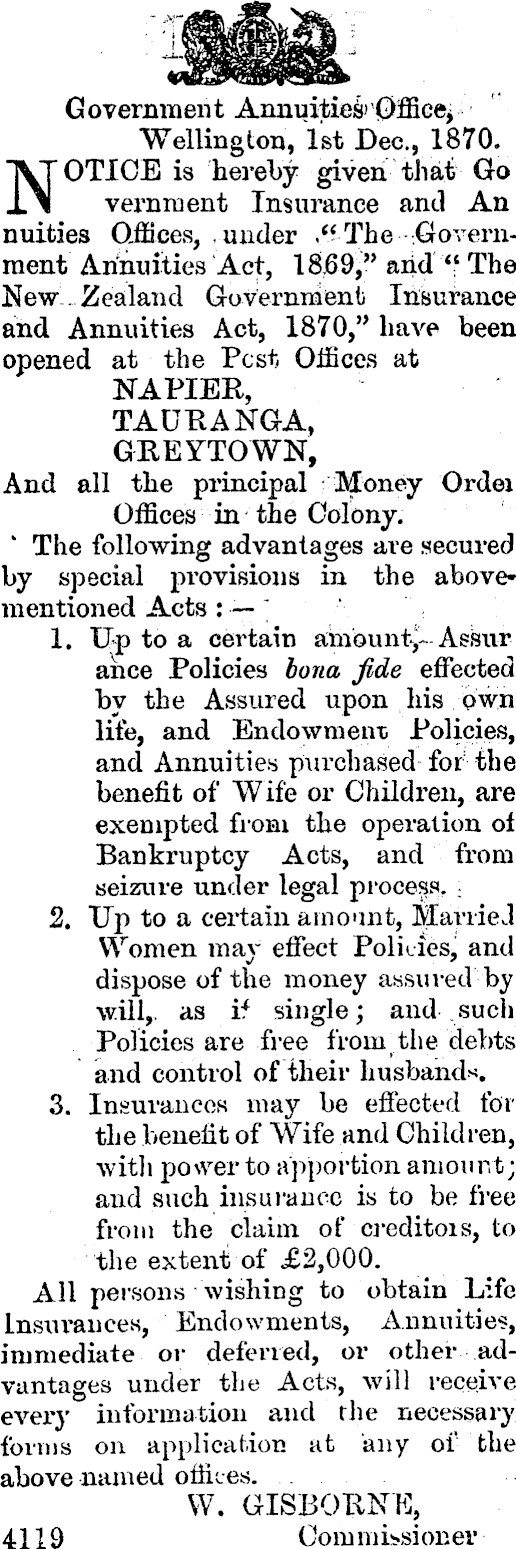 Government Annuities Office* Wellington, Ist Dec, 1870. NOTICE is hereby given that Go vernnient Insurance and An nuities Offices, under & The Government Annuities Act, 1&69," and " The New Zealand Government Insurance and Annuities Act, 1870," have been opened at the Pest Offices at NAPIER, TAUEANGA, GREYTOWN, And all the principal Money Ordei Offices in the Colony. The following advantages are secured by special provisions in the abovementioned Acts : —; 1. Up to a certain amount,-• Assurance Policies bona fide effected by the Assured upon his own life, and Endowment Policies, and Annuities purchased for the benefit of Wife or Children, are exempted from the operation of Bankruptcy Acts, and from seizure under legal process. ; 2. Up to a certain amoant, Married Women may effect PolkieSj and dispose of the money assured" by will, as if single ; and such Policies are free from the debts and control of their husband*. 3. Insurances may be effected for the benefit of Wife and Children, witli power to apportion amount; and such insurance is to be free from the claim of creditois, to the extent of £2,000. All persons wishing to obtain Life Insurances, Endowments, Annuities, immediate or deferred, or other advantages under the Acts, will receive every information and the necessary forms on application at any of the above named offices. W. GISBORNE, 4119 Commissioner