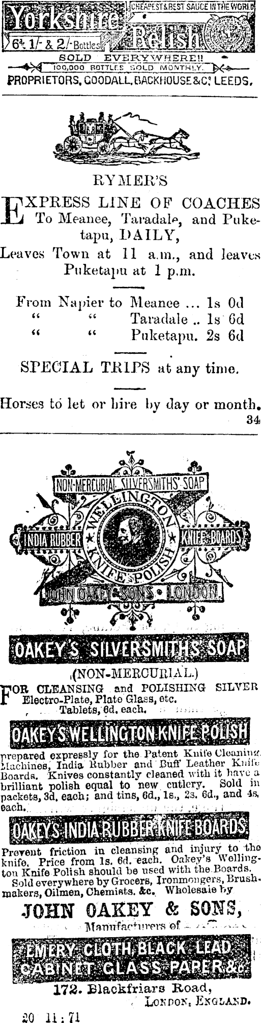 111111111111 •-. t . -. 'V? , -^i si ;6*l/-&2/-Bottle S ll SOLD EVERYWHERE!! PROPRIETORS, COODALL,BACKHOUSE&C? LEEDS, RYMER'S EXPRESS LINE OF COACHES To Meanee, Tai-adal**, and Puketapu, DAILY, Leaves Town at 11 a.m., and leaves Puketapu at 1 p.m. From Napier to Meanee ... Is Od Taradale.. Is Od " " Puketapu. 2s 6d SPECIAL TRIPS afc any time. Horses to let or hire by day or month. 34 SWTHST-SQAP iim'f. MKEY* SIWERpIIIiiOAFt .(NON-MERCURIAL.) OR CLEANSING and POLISHING SILVER Electro-Plate, Plato Glass, etc. Tablets, 6d. each. OAKEYSitLLINQJON KNiptiiKH prepared expressly for the Patent Kuii'e Cleaning. Boards. Knives constantly cleaned with it have a brilliant polish equal to new cutlery. Sold in packets, 3d. each; and tins, 6d., Is., 23. 6d., and 4s. each. .;:...; '>:.'.. ii _. sKfc INDIA RUBBaJIFfBOAftDS; Prevent friction in cleansing and injury to u knife. Price from Is. 6d. each. Oakeys ton Knife Polish should be used with the Boards. Sold everywhere by Grocers, Ironmongers, Brusfc. makers, Oilmen, Chemists. &c. Wholesale by JOHN OAEEY & SOHS, MftTi'trfactiivprs of ■ -' -•--- >• 172. Blaokfriars Road, , LoKPOKt EKGIiAKD. 30 u-.n