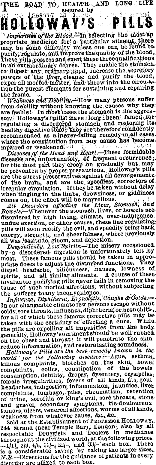 «HE BO4D Tp ; HEALTH ,Asn> LONG LIFE secured by ' Jbtrfiiritik QfitheJ&ldod,— ln "selecting the propriate medicine; for! a. particular ailment,, may. be some difficulty' unless..one can he found to. purify, regulate, sa& improve of the blood. These pillaipqssess and exertthesethreequaliflpatiops in ail extraordinary degree. They enable the stomachs to digest? anyi s o?dinaryrioPd, increase tho secretory powers of ~ the live/, cleanse and purify the blood,, expei all mof-Bid matter, and throw into the circulation the purest elements for sustaining aud repairing WeSJcne'ss andWebttky.—JLvw many persons suffer - from debility without knowing the causes why they are feeble! In most cases the stomach is the aggressor.' ! Holloway's Ipillsihave > long been famed,.Jbrregulating a disordered and restoring its recommended as a [never-failing remedy-in>aU cases where the constitution from any oause has become mpaired or weakened! :i % • 1 ~ Diseases of the Head and Heart.— These formidable diseases are, unfortunately^.of frequent occurrence;, for the most part they creep "on gradually but. may be prevented by proper precautions. Holloway's pills are the surest preservatives against all derangements of the brain, Bnd are the speediest correctors of irregular circulation. If they be .taken without delay when tingling in the limbs, drowsiness, or giddiness comes on, tbe effect will be marvellous. . .•- , ■. All Disorders affecting the Liver, Stomach, and Bowels.— Whenever the stomach, liver, or bowels are disordered by high living, climate, over-indulgence pills will soon rectify the evil, and speedily bring back, energy, strength, and cheerfulness, where previously all was lassitude, gloom, and dejection. Despondency, Low Spirits,— The misery occasioned by a disordered digestion is unfortunately felt iy most. These famous pills should be taken in appropriate doses to adjust the disturbed functions. They dispel headache, biliousness, nausea, lowness of spirits, and all similar ailments. A course of invaluable purifying piils never fails in removing the tause of such morbid affections, without subjecting, the sufferer toany inconvenience. Influenza, Diphtheria, Bronchitis, Coughs & Colds. — In our changeable climate few persons escape without colds, sore throats, influenza, diphtheria, or bronchitis., for all of which these famous corrective pills may be taken with the certainty of effecting a cure. While, the pills are expelling all impurities .- from the body generally, Holloway'sointment should be well rubbed, on the chest and throat: it will penetrate the skin reduce inflammation, and restore lasting soundness. Holloway's Pills are the best remedy known in the world jor the following diseases .—Ague, asthma,, kilious complaints, blotches on the skin, bowel complaints, colics, constipation of the bowels consumption, debility, dropsy, dysentery, erysipelas, female irregularities, fevers of all kinds, flts, gout headaches, indigestion, inflammation, jaundice, live* complaints, lumbago, piles, rheumatism, retention of urine, scrofula or king's evil, sore throats, stone: and gravel, secondary symptoms, tic-douloureux tumors, ulcers, venereal affections, worms of all kinds,, weakness from whatever cause, &c.».&c» Sold at the .Establishment of Paofisssoa Hollow ay,. 244 Strand (near Temple Bar), London; also .by aIL respectable Druggists and Dealers in medicine* throughout the civilized world, at the following prices —l/li z/9, 4/6, Ufa 22/-, and 33Keach box. There is a considerable saving by taking the larger sizes. N.B.— Directions for the guidance of patients in every, disorder are aifixed to each box.