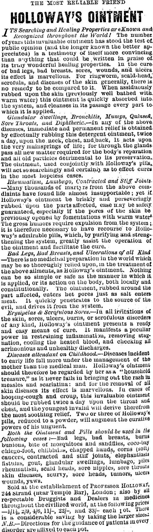 THE MOST RELIABLE EEIEUD •* Recognized throughout the World! Th< of years this invaluable ointment has stood the test ot public opinion (and the longer known the better appreciated) is a testimony of itself more convincing, than anything that could he.written in praise of its truiy wonderful healing properties. In the cure of bad legs, bad breasts, sores, wounds, and ulcers its effect is marvellous. l?or ringworm, scald-head,, scrofula, and diseases of the skin generally, there is no remedy to be compared to it. When assiduously rubbed upon the skin "(previously well bathed with, warm water) this ointment is quickly absorbed into the system, and cleanses in its passage every part to-. which it is applied. Glandular Swellings, Bronchitis, Mumps, Quinseß, Sore Throats, and Diphtheric—in. any of the above, diseases, immediate and permanent relief is obtained by effectually rubbing this detergent ointment, twice a day, upon the. neck, chest, aud.back, It acts upon the very mainsprings of life; for through the glands pass all new matter required for the body's reparation and all old particles detrimental to its preservation. The ointment, used conjointly with HolLoway's pills,, will actsoseaiehingly and certainly as to effect cures in the most hopeless cases. Rheumatism, Lumbago, Contracted and Stiff. Joints, —Many thousands of martyrs from the above coindlaints have found life almost insupportable ; yet it Holloway's ointment be briskly and perseveriugly rubbed upou the parts affected, ease n.ay be safely guaranteed, especially if the pores of the skin be previously opened by fomentations with warm water' The gross humors require expulsion from the system;, it is therefore necessary to have recourse to Holloway's admirable pills, which, by purifying and strengthening the system, greatly assist the operation of the ointment and facilitate the cure. Bad Legs, Bad Breasts, and Ulcerations of all Kind —There is no medicinal preparation in the world which may be so thoroughly relied upon, in the treatment of the above ailments, as Holloway's ointment. Nothing can be so simple or safe as the manner in which it. is applied, or its action on the body, both locally and constitutionally. The ointment, rubbed around the part affected, enters het pores just as salt enters meat. It quickly penetrates to the source of the. evil, and drives it from the system. Erysipelas & Scrofulous Sores.—ln all irritations of the skin, sores, ulcers, burns, or scrofulous disorders of any kind, Holloway's ointment presents a ready and easy means of cure, ft manifests a peculiar power in restraining inflammation, removing stagnation, cooling the heated blood, and checking all acrimonious and unhealthy discharges. Diseases attendant on Childhood—Diseases incident to early life fall more under the management of the mother tnan the medical man. Holloway's ointment should therefore be regarded by her as a "household treasure," as it never fails in bringing out the rash iu measles and scarlatina: and for the removal of all skin diseases its effect is marvellous. In cases of hoopiug-cough and croup, this invaluable ointment should bo rubbed twice a day upon the throat and chest, and the youngest invalid will derive therefrom the most soothing relief. Two or three ot Holloyvav a pills, reduced to a powder, will augment the curative powers of his unguent. ~ ,«„ Both the Ointment and Pills should be used in (M following cases .—Bad legs, bad breasts, bums bunions, bite of mosquitoes and sandflies, coco-bay ohiego-foot, chilblains, chapped hands, corns (soli) caucers, contracted and stiff joints, elephantiasis fistulas, gout, glandular swellings, lumbago, pu<* rheumatism, scald heads, sore nipples, sore turouts skin diseases, scurvy, sore heads, tumors, ulcers wounds, yuws. Sold at the establishment of Pbofessoe Hollo wa>, 244 strand (near Temple Bar), Loudon; also by ah respectable Druggists and Dealers in medicines throughout the civilized world, at the follow ing price* —l/Is, 2/tf, 4/6,11/-, 22/-, and 33/- each iot. 'lucre is a considerable saving by taking the larger sues.. N.B.— Directions for the guidance of patients meveiy disorder are affixed to each pot.