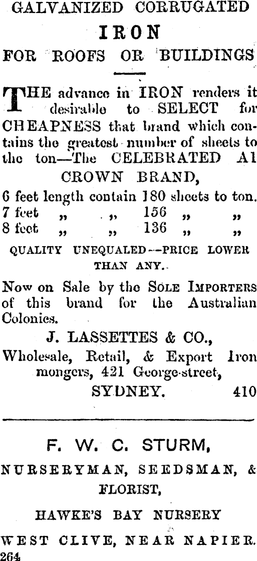 GALVANIZED CORRUGATED IRON FOR ROOFS OR BUILDINGS HE advance in IRON renders it desirable to SELECT for CH EAPNE3S that brand tf hich contains the greatest number of sheets to the ton—The CELEBRATED Al CROWN BRAND, 6 feet length contain 180 sheets to ton. 7 feet „ „ 156 „ „ 8 feet „ „ 136 „ „ QUALITY UNEQUALED- -PRICE LOWEK THAN ANY. Now on Sale by the Sole Importers of this brand for the Australian Colonics. J. LASSETTES & CO., Wholesale, Retail, & Export Iron mongers, 421 George-street, SYDNEY. 410 F. W. C. STURM, NURSEEYMAN, SEEDSMAN, & ELORIST, HAWEE'S BAY NURSERY WEST OLIVE, NEAR NAPIER. 264
