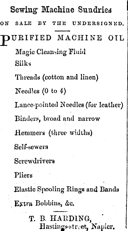 Sewing Machine Sundries ON" SALE BY TJIE UNDERSIGNED. URIFIED MACHINES OIL Manic Cleansing Fluid Threads (cotton and linen) Needles (0 to 4) Lance-pointed Needles (for leather) Binder?, broad and narrow Hermners (three widths) Self-sewers Screwdrivers Fliers Elastic Spooling Rings and Bands JSjtra Bobbins, &c. T. B. HARDING, H astings-tsti*vet, Napier.