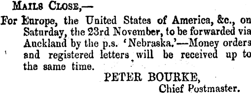 Mails Close,— For Europe, the United States of America, &c., on Saturday, the 33rd November, to be forwarded via Auckland by the p.s. ‘Nebraska.’—Money orders ' and registered letters will be received up to the same time. PETER BOURKB, Chief Postmaster.