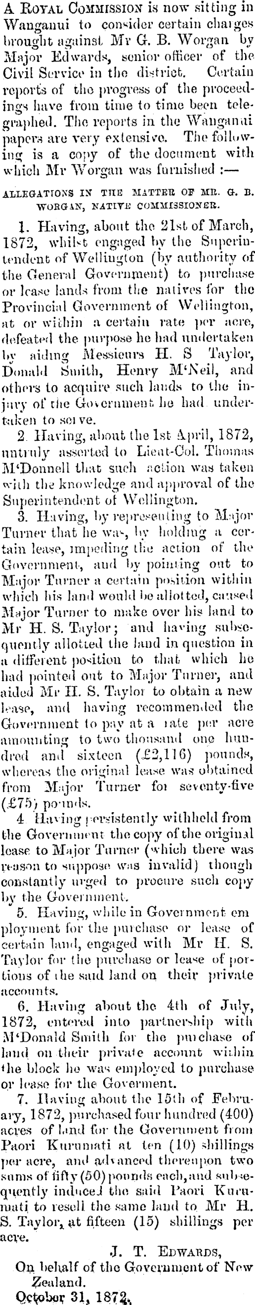 A Royal Commission is now sitting in Wanganui to consider certain charges brought aguinsl Mv G. B. Worgan by Major Edwards, senior officer ot the Civil Service in the district. Certain reports of the progress of the proceedings have from time to time been telegraphed. The reports in the Wanganai papers are very extensive. The following is a copy of the document with which Mr Worgan was furnished : ALLEGATIONS IX THE MATTEU OF MR. 0-. B. •WORGAN, NATIVE COMMISSIONER. 1. Having, about the 21st of March, 1872, whilst engaged by the Superintendent of Wellington (by authority of the General Government) to purchase or lease lands from the natives for the Provincial Government of Wellington, at or within a certain rate per acre, defeated the purpose he had undertaken by aiding Messieurs H, S Taylor, Donald Smith, Henry M'Neil, and others to acquire such lauds to the injury of the Government, he had undertaken to soi ve. 2 Having, about the Ist April, 1872, untruly asserted to Lieut-Col. Thomas M'Donnell that such action was taken with the knowledge and approval of the Superintendent ot Wellington. 3. Having, by representing to Major Tinner that he wa~, hv holding a certain lease, impeding the action of the Government., and by pointing out to Major Turner a certain position within which his land would bo allotted, cuuxed Major Turner to make over his land to Mr H. S. Taylor; and having subsequently allotted the laud in question in a different position to that which he had pointed out to Major Turner, and aided Mr 11. S. Taylor to obtain a new lease, and having recommended the Government to pay at a late per acre amounting to two thousand one hundred and sixteen (£2,116) pounds, whereas the original lease was obtained from Major Turner foi seventy-five (.£75) pounds. 4 [laving persistently withhold from the Government the copy of the original lease to Major Turner (which there was reason to suppose was invalid) though constantly urged to procure such copyby the Government, 5. Having, while in Government em ployment for the purchase or lease of certain land, engaged with Mr 11. S. Taylor for the purchase or lease of portions of ihe said land on their private accounts. 6. Having about the 4th of July, 1872, entered into partnership with M'Donald Smith for the puichase of land on their private account within <he block ho was employed to purchase or lease for the Gorerment. 7. Having about the 15th of February, 1872, purchased four hundred (400) acres of land for the Government from Paori Kuril mati at ten (10) shillings per acre, and advanced thereupon two sums of fifty (50) pounds each,and subsequently induce J the said Paori Kurilmati, to resell the same land to Mr H. S. Tayloi\ at fifteen (15) shillings per acre. J. T. Edwards, On behalf of the Government of New Zealand.