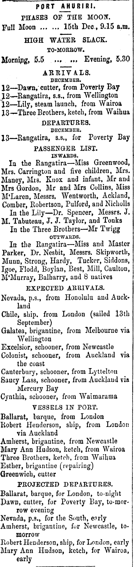 PORT AHUBIRi. PHASE 3 OF THE MOOT?. full Moon 15th Dec, 9.15 a.m. HIGH WATER SLACK. TO-MORROW. Morning, 5.5 Evening, 5.30 ARRIVALS. DECEMBER. 12 —Dawn, cutter, from Poverty Bay J2—-Rangatira, s.s., from Wellington 12 —Lily, steam launch, from Wairoa 13—Three Brothers, ketch, from Waihua DEPARTURES. DECEMBER. 13 —Rangatira, s.s M for Poverty Bay PASSENGER LIST. INWAEDS. In the Rangatira—Miss Greenwood, Mrs. Carrington and five children, Mrs. Maney, Mis. Knox and infant, Mr and Mrs Gordon, Mr and Mrs Collins, Miss M'Laren, Messrs, Wentworth, Ackland, Comber, Robertson, Pulford, and Nicholls In the Lily—Dr. Spencer, Messrs. J. M. Tabuteau, J. J. Taylor, and Tonks In the Three Twigg OUTWAEDS. In the Rangatira —Miss and Master Parker, Dr. Nesbit, Messrs. Skipwortb, Munn, Strong, Hardy, Tucker, Siddons, Igoe, Flodd, Boylan, Best, Mill, Caulton, M'Murray, Balharry, and 8 natives EXPECTED ARRIVALS. Nevada, p.s., from Honolulu and Auckland Chile, ship, from London (sailed 13 th September) Galatea, brigantine, from Melbourne via Wellington Excelsior, schooner, from Newcastle Colonist, schooner, from Auckland via the coast Canterbury, schooner, from Lyttelton Saucy Lass, schooner, from Auckland via Mercury Bay Cynthia, schooner, from Waimarama VESSELS IN PORT. Ballarat, barque, from London Robert Henderson, ship, from London via Auckland Amherst, brigantine, from Newcastle Mary Ann Hudson, ketch, from Wairoa Three Brothers, ketch, from Waihua Esther, brigantine (repairing) Greenwich, cutter PROJECTED DEPARTURES. Ballarat, barque, for London, to-night Pawn, cutter, for Poverty Bay, to-mor-row evening Nevada, p.s., for the South, enrly Amherst, brigantine, fur Newcastle, tomorrow Robert Henderson, ship, for London, early Mary Ann Hudson, ketch, for Wairoa, early