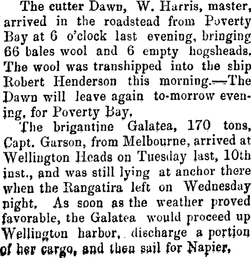 The cutter Dawn, W. Harris, master, arrived in the roadstead from Poverty Bay at 6 o'clock last evening, Imaging 66 bales wool and 6 empty hogsheads. The wool was transhipped into the ship Robert Henderson this morning.WThe Pawn will leave again to-morrow evening, for Poverty J3ay, The brigantine Galatea, 170 tons, Capt. Garson, from Melbourne, arrived at Wellington Heads on Tuesday last, 10th jnst., and was still lying at anchor there when the Kangatira left on Wednesday pigbt. As soon as the weather proved favorable, the Galatea would proceed up Wellington harbor, discharge a portion Of b«P cargo, and then m\ fov Napier,