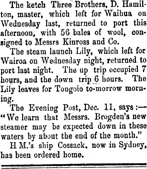 The ketch Three Brothers, D. Hamilton, master, which left for Waihua on Wednesday last, returned to port this afternoon, with 56 bales of wool, consigned to Messrs Kinross and Co. The steam launch Lily, which left for Wairoa on Wednesday night, returned to port last night. The up trip occupied 7 hours, and the down trip 6 hours. The Lily leaves for Tongoio to-morrow morning. The Evening Post, Dec. 11, says : "We learn that Messrs. Brogd en's new steamer may be expected down in these waters by about the end of the month." H M.'s ship Cossack, now in Sydney, has been ordered home. ■ ■ mn——W—^—^— ——*—