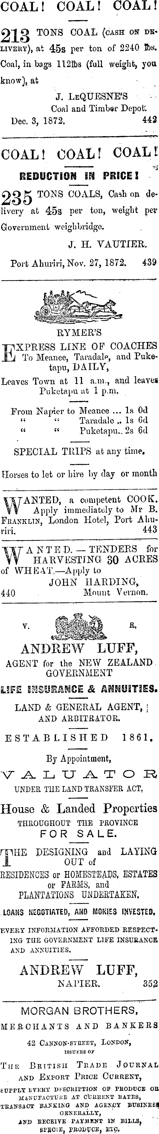 COAL! COAL! COAL! 91 Q TONS COAL (cash on delivery), at 45s per ton of 2240 lbs. Coal, in bags 112ft>s (full weight, you know], at J. LeQUESNE'S Coal and Timber Depot; Dec. 3, 1872. 442 COAL! COAL! COAL! 1 ( TONS COALS, Cash on delivery at 45s per ton, weight pey Government weighbridge. J. EL YAUTIER, Port Ahuriri, Nov. 27, 1872. 439 RYMER'S 17XPRESS LINE OF COACHES Vl To Meanee, Taradale, and Puketapn, DAILY, Leaves Town at 11 a.m., and leaver Puketapu at 1 p.m. From Napier to Meanee ... Is Od « « Taradale ..Is 6d « " Puketapu.. 2s 6d SPECIAL TRIPS at any time. Horses to let or hire by day or month 'T7ANTED, a competent COOK. /V Apply immediately to Mr B. Frankltn, London Hotel, Port Ahuriri. 443 /■ANTED. TENDERS for ' pi a r Vesting so acres of WHEAT.—AppIy to JOHN HARDING, 440 Mount Vernon. ANDREW LUFF, AGENT for the NEW ZEALAND GOVERNMENT LIFE I&SURANCE & ANNUIT9ES. LAND & GENERAL AGENT, j AND ARBITRATOR. ESTABLISHED 1861. By Appointment, V" .A. L TJ -A. T O R UNDER THE LAND TRANSFER ACT, House & Landed Properties THROUGHOUT THE PROVINCE FOR SALE. mHE DESIGNING and LAYING A OUT of RESIDENCES or HOMESTEADS, ESTATES or FARMS, and PLANTATIONS UNDERTAKEN. LOANS NEGOTIATED, AND MOK|ES INVESTED, EVERY INFORMATION AFFORDED RESPECTING THE GOVERNMENT LIFE INSURANCE AND ANNUITIES. ANDREW" LUFF, NAPIER, 352 MORGAN BROTHERS, MERCHANTS AND BANKERS 42 Cannon-street, London, The British Trade Journal and Export Price Current, SUPPLY EVERY D KSCKIPTION OP PRODUCE Oil MANUFACTURE AT CURRENT BATES, TRANBACT BANKING AND AGENCY BUSINESS GENERALLY, AND RECEIVE PAYMENT IN BILLS, BPEOLE, PRODUCE, ETC,