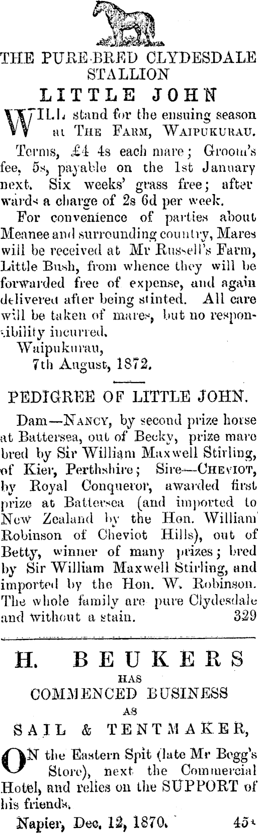 THE PUREBRED CLYDESDALE STALLION LITTLE JOHN stand for the ensuing season tu The Farm, Waipukurau. Terms, £4 4s each mare; Groom's fee, ss, payable on the Ist January next. Six weeks' grass free; after wards a charge of 2s 6d per week. For convenience of parties about Meaneeand surrounding country, Mares will be received at Mr Russell's Farm, Little Bush, from whence they will be forwarded free of expense, and again deliverer afier being stinted. All care will be taken of mares, but no responsibility incurred, Waipukurau, 7th August, 1871 PEDIGREE OF LITTLE JOHN. Dam—Nancy, by second prize horse at Battersea, out of Becky, prise mare bred by Sir William Maxwell Stirling, of Kier, Perthshire; Sire—Cheviot, by Royal Conqueror, awarded first prize at Battersea (and imported to New Zealand by the Hon. William Robinson of Cheviot Hills), out of Betty, winner of many prizes; bred by Sir William Maxwell Stirling, and imported by the Hon. W. Robinson. The whole family are pure Clydesdale and without a stain. 329 H. BEUKERS HAS COMMENCED BUSINESS AS BAIL & TENT MAKER, ON the Eastern Spit (late Mr Begg's Store), next the Commercial Hotels and relies on the SUPPORT of his friends Napier, Dec. U, 1870, 45*