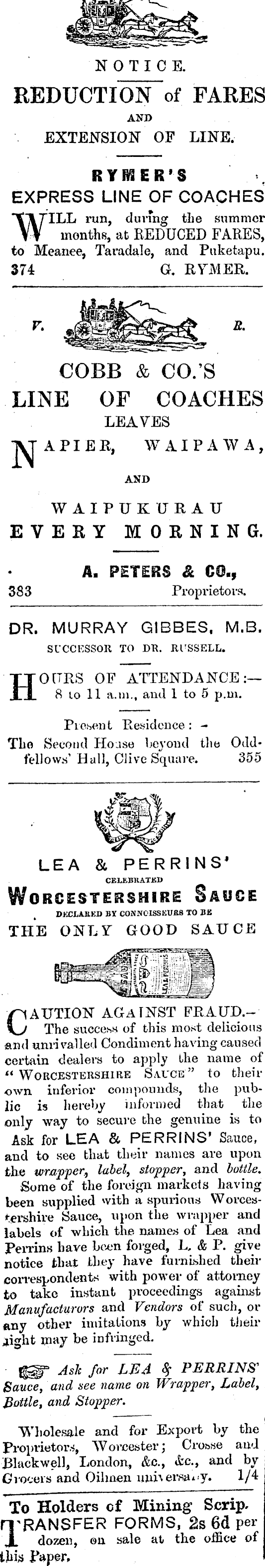 NOTICE. FARES AND EXTENSION OF LINE. RYMER'S EXPRESS LINE OF COACHES TILL run, during the summer / months, at REDUCED FARES, to Meanee, Taradale, and Puketapu. 374 G. RVMER. COBB & CO.'S LINE OF COACHES LEAVES APIER, WAIPAWA, WAIPUKURAU EVERY MORNING. 383 Proprietors. DR. MURRAY GIBBES, M.B. SUCCESSOR TO DR. RUSSELL. HOURS OF ATTENDANCE:— 8 lo 11 a.m., and 1 to 5 p.m. Present Residence: - The Second House beyond the Oddfellows' Hall, Olive Square. 355 LEA & PERRINS' CELEBRATED WORCESTERSHIRE SaUOE DECLARED BY CONNOISSEURS TO BE THE ONLY GOOD SAUCE CAUTION AGAINST FRAUD.U The success of this most delicious and unrivalled Condiment having caused certain dealers to apply the name of " Worcestershire Sauce'" to their own inferior compounds, the public is hereby informed that the only way to secure the genuine is to Ask for LEA & PERRINS' Sauce, and to see that their names are upon the wrapper, label, stopper, and bottle. Some of the foreign markets having been supplied with a spurious Worcestershire Sauce, upon the wrapper and labels of which the names of Lea and Pen-ins have been forged, L, & P. give notice that they have furnished their correspondents with power of attorney to take instant proceedings against Manufacturors and Vendors of such, or any other imitations by which their may be infringed. Ash for LB A # PERRINS' Sauce, and see name on Wrapper, Label, Bottle, and Stopper. Wholesale and for Export by the Proprietors, Worcester; Crosse and Black well, London, &c, &c, and by Grocers and Oilmen To Holders cf Mining Scrip, r TRANSFER FORMS, 2s 6d per X dozen, on sale at the office of this Paper,