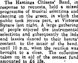The Hastings Citizens’ Band, in response to requests, held a mixed programme of musical selections and dancing on the green, in which the public took joyous part, at Victoria Square last night. A large gathering of people enjoyed the instrumental selections and subsequently the lads and lassies danced to their hearts' content, to the music of the band, until 10 p.m. when the reunion was brought to a close. The collection taken up in aid of the contest fund amounted to £4 13s.