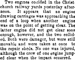 Two engines collided in the Christ-, church railway yards yesterday afternoon. It appears that an engine drawing carriages was approaching the end of a loop when another engine was on the point of getting clear. The latter engine did not get clear soon en.ough, however, and the two collided. Both were daniager, but were still movable and were taken at once to the repair sheds. No one was injured, although the crew of one engine jumped clear when the impact occurred.