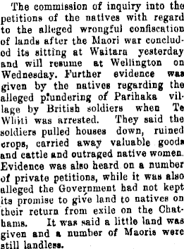 The commission of inquiry into the petitions of the natives with regard to the alleged wrongful confiscation of lands after the Maori war concluded its sitting at Waitara yesterday and will resume at Wellington on Wednesday. Further evidence was given by the natives regarding the alleged plundering of Parihaka village by British soldiers when Te Wliiti was arrested. They said the soldiers pulled houses down, ruined crops, carried away valuable goods and cattle and outraged native women. Evidence was also heard on a number of private petitions, while it was also alleged the Government had not kept, its promise to give land to natives on their return from exile on the Chathams. It was said a little land was given and a number of Maoris were still landless.