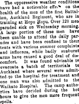 The opporessive weather conditions liave had a noticeable effe.w on the health of the men of the first Battalion, Auckland Regiment, who are in training at Hopu Hopu. Over 120 men paraded sick on Wednesday morning. A large portion of these men have been unable to attend the daily parades and have been confined to their tents with various summer complaints and influenza, while badly sunburnt arms have caused a good deal of discomfort. It was found advisable to evacuate a batch of territorials to Auckland where several were admitted to the hospital for treatment and one man was also admitted to the Waikato Hospital. The camp authorties have decided during the hot hours to give the men more frequent spells.