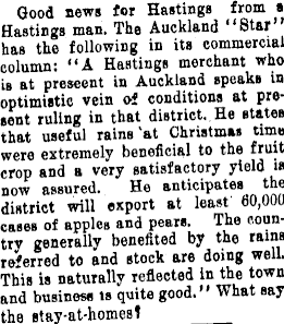 Good news for Hastings from a Hastings man. The Auckland “Star’ has the following in its commercial column: “A Hastings merchant who is at preseent in Auckland speaks in optimistic vein of conditions at present ruling in that district. He states that useful rains at Christmas time were extremely beneficial to the fruit crop and a very satisfactory yield is now assured. He anticipates the district will export at least 60,000 cases of apples and pears. The country generally benefited by the rains referred to and stock are doing well. This is naturally reflected in the town and business is quite good.” What say the stay-at-homest ___