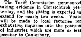 The Tariff Commission commenced taking evidence in Christchurch yesterday, and the sitting is expected to extend for nearly two weeks. Visits will be made to local factories tor exhaustive Inquiries into the position of industries which are more or less peculiar to Canterbury,