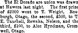 Th 4 Bl Dorado are union was drawn at Hawera last night. The first prize of £2OOO wont to T. Weight, Boxburgh, Otago, the second, £5OO, to T. E. Tauchell, Bewaka, Nelson, and the third, £lOO, to Alec Hyndman, Cromwell, Otago.