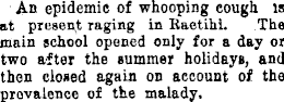 An epidemic of whooping cough is at present raging in Raetihi. The main school opened only for a day or two after the summer holidays, and then closed again on account of the prevalence of the malady.