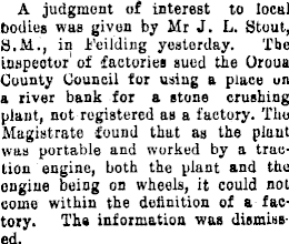 A judgment of interest to local bodies was given by Mr J. L. Stout, S.M., in Feilding yesterday. The inspector 1 of factories sued the Oroua County Council tor using a place on a river bank for a stone crushing plant, not registered as a factory. Thu Magistrate found that as the plant was portable and worked by a traction engine, both the plant and the engine being on wheels, it could not come within the definition of a factory. The information was dismissed.