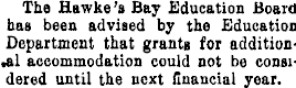 The Hawke’s Bay Education Boarfl has been advised by the Education Department that grants for additional accommodation could not be considered until the next financial year.