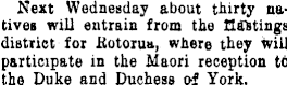Next Wednesday about thirty natives will entrain from the Hastings district for Rotorua, where they will participate tn the Maori reception to the Duke and Duchess of York.