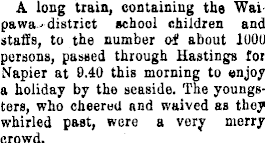 A long train, containing the Wai pawa district school children and staffs, to the number of about 1000 persons, passed through Hastings for Napier at 9.40 this morning to enjoy a holiday by the seaside. The youngsters, who cheered and waived as they whirled past, were a very merry crowd.