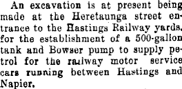 An excavation is at present being made at the Heretaunga street entrance to the Hastings Railway yards, for the establishment of a 500-gallon tank and Bowser pump to supply petrol for the railway motor service cars running between Hastings and Napier.