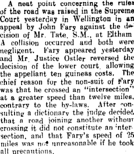 A neat point concerning the rules of the road was raised in the Supreme Court yesterday in Wellington in an appeal by John Fary against the d«cision of Mr. Tate. S.M., at ELtham A collision occurred and both were negligent. Fary appeared yesterday and Mr. Justice Ostler reversed the decision of the lower court, allowing the appellant ten guineas costs. The chief reason for the non-suit of Fary was that he crossed an "intersection” at a greater speed than twelve miles, contrary to the by-laws. After ponsultinc a dictionarv the judge decided, that a road joining another without crossing it did not constitute an ’ntersection, and that Fary’s speed of 25 miles was no* unreasonable if he took all precautions.