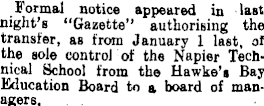Formal notice appeared in last night’s “Gazette" authorising the transfer, as from January 1 last, of the sole control of the Napier Technical School from the Hawke’s Bay Education Board to a board of managers.
