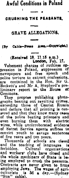 Awful Conditions in Poland CRUSHING THE PEASANTS, GRAVE ALLEGATIONS. [By Cable—Press Aren.-Copyrirtt) (Received 18, 11.16 a.m.) London, Feb. 17. Vehement charges of ruthless oppression in Poland, suppression of newspapers and free speech and police torture to extract confessions, are contained in the Hon. Sir G. Beckett’s and Mr A. Stepherd’s preliminary report to the House of Commons. They propose publishing photographs bearing out revolting crimes, exceeding those of Czarist Russia and declare that all printing is censored and that they know many cases of the police beating prisoners and even burning them with electric wires, while uncorroborated evidence of Secret Service agents suffices to convict youth to savage sentences of five years and ten years. Thousands of schools are closed and the teaching of languages is forbidden. Cultural organisations and workers’ clubs have closed and the whole machinery of State is being employed to crush the peasants. Contracts are never given to firms employing Jews. The wages of agriculturists is 3d a day.—(Sydney "Sun” cable).